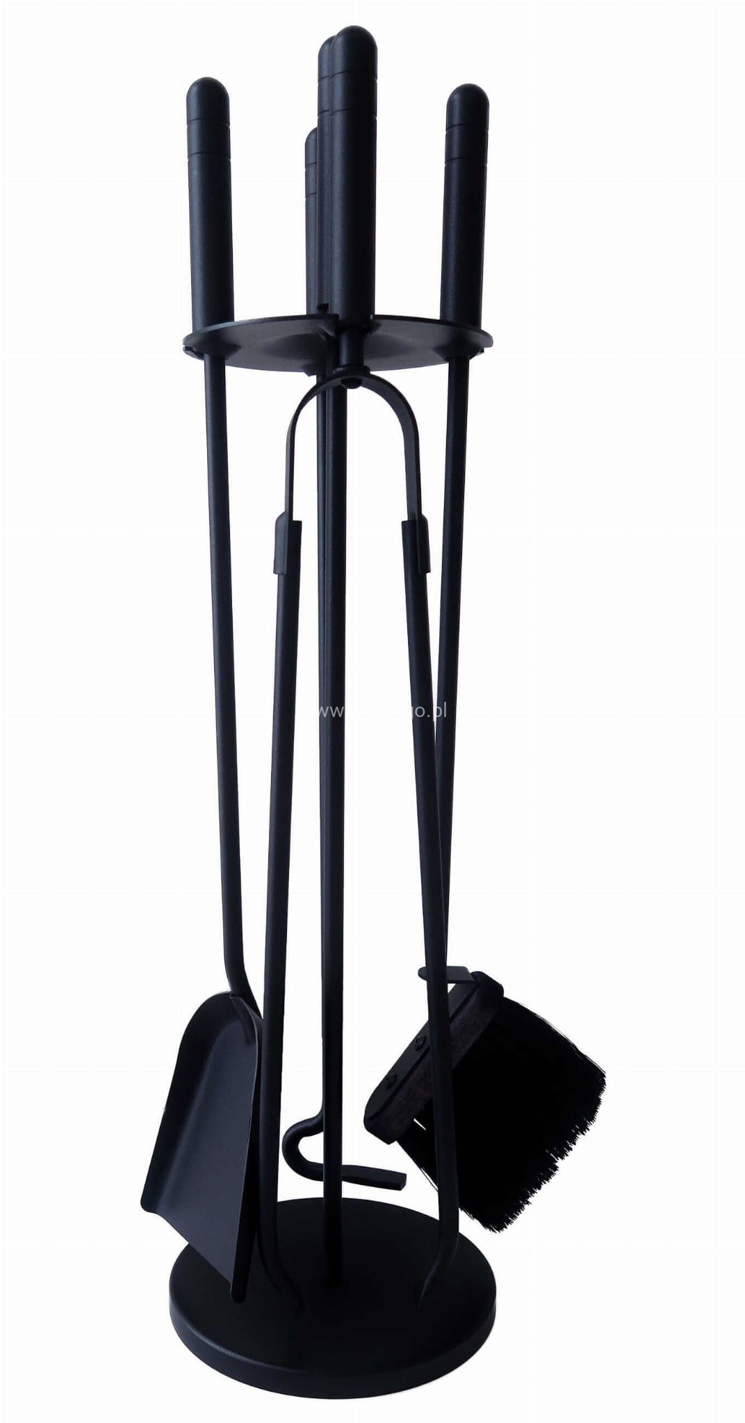 W skład zestawu wchodzą: szczotka, szufelka, pogrzebacz oraz szczypce, osadzone na stojaku z okrągłą podstawą. Rączki poszczególnych przyborów oraz stojaka posiadają delikatne poziome żłobienia.